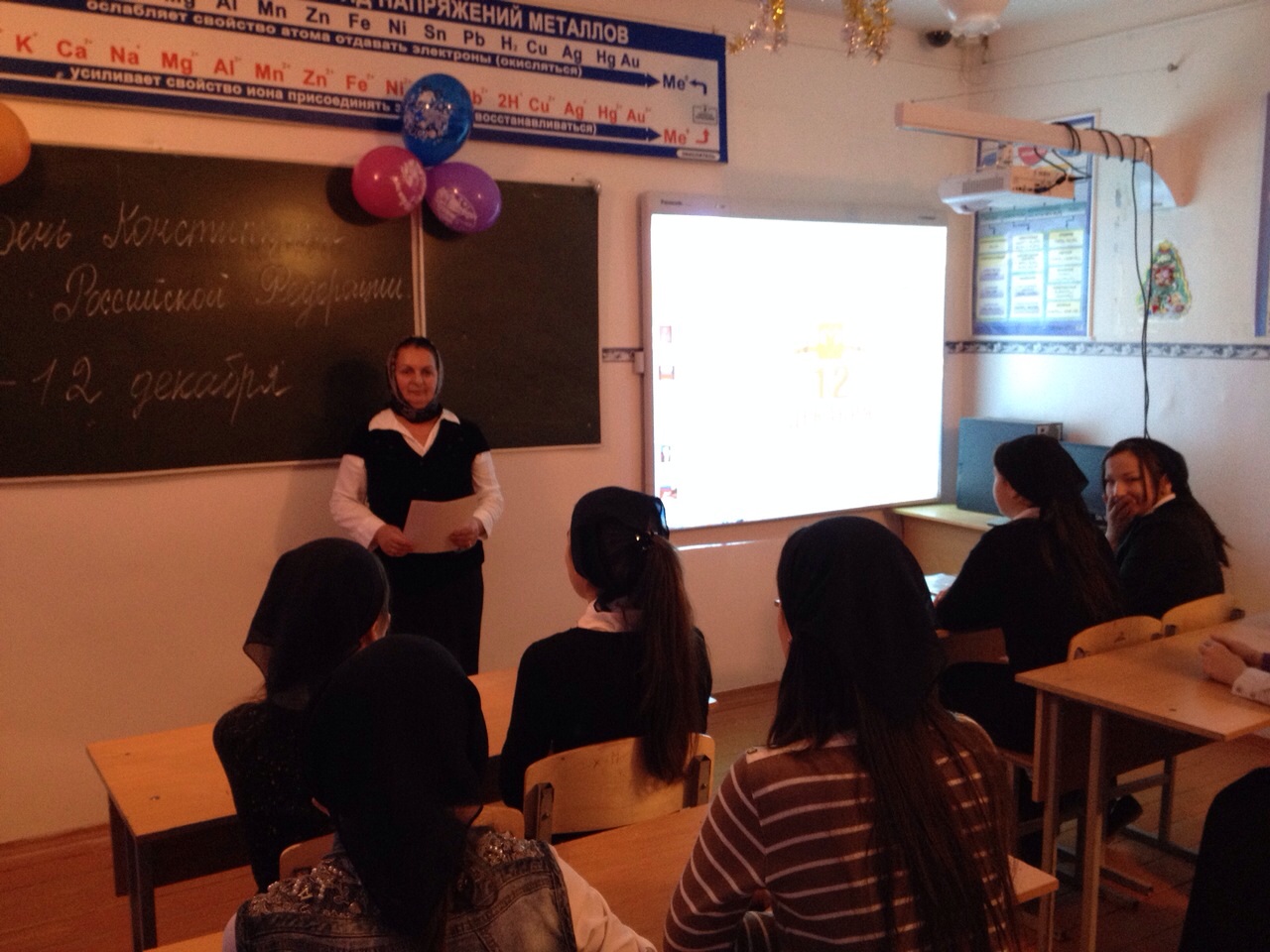 Мероприятие было организовано зам. директора по ВР Саламовой Э.Г., учителем истории Умаровой Н.А., ОДД Абдурашидовой Х.К. Началось мероприятие с исполнения Гимна Российской Федерации. В своем вступительном слове учитель истории Умарова Н.А. сказала: «Хочется начать нашу встречу со слов Цицерона: «Мы должны стать рабами законов, чтобы стать свободными!» В этом году исполняется 21 год со дня принятия Конституции Российской Федерации. Конституция – это Основной Закон государства, акт высшей юридической силы». Нуржан Абдул – Азизовна дала общую характеристику понятию и признакам Конституции. Рассказала, когда была принята Конституция РФ, об исторических этапах конституционного развития России. Была показана презентация «Конституция России».Провели викторину на знание вопросов, связанных с конституционным устройством России, конкурс «Вставь пропущенное слово» на знание текста Конституции РФ. Вспомнили Символы РФ, их историю, значение. Мероприятие способствовало осознанию ценности Конституции РФ как Основного закона страны, пониманию прав человека, формированию уважения к правам других людей. Мероприятие прошло организованно, с высокой активностью учащихся.