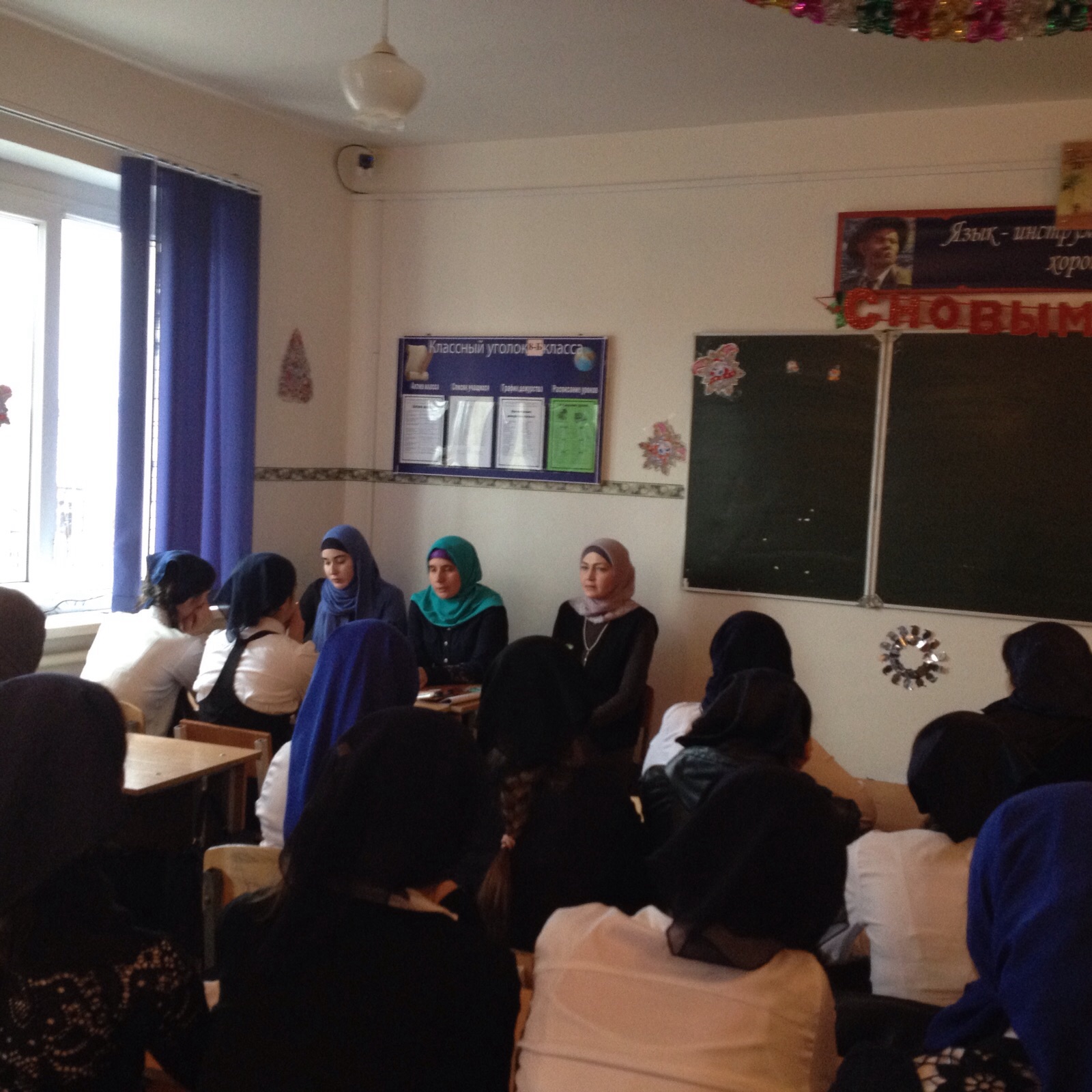 21.10.201521 декабря 2015 г. в МБОУ «СОШ №6 г. Шали» состоялась встреча с активистами ЧРОО «Иман» Рашидовой Сурьяной, Абуезидовой Мадиной, Хучиевой Луизой, организованная для учащихся (девочек) 8-11 классов.