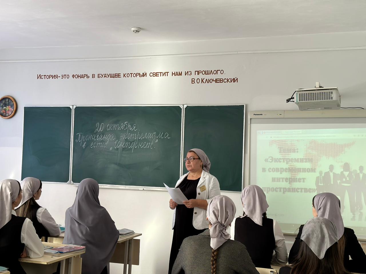 20.10.2023Отделом в Шалинском районе УФСБ России по Чеченской Республике совместно с МУ «Отдел образования Шалинского муниципального района Чеченской Республики» проведено профилактическое мероприятие в МБОУ "СОШ №6 г.Шали" на тему: «Пропаганда экстремизма в сети «Интернет».
