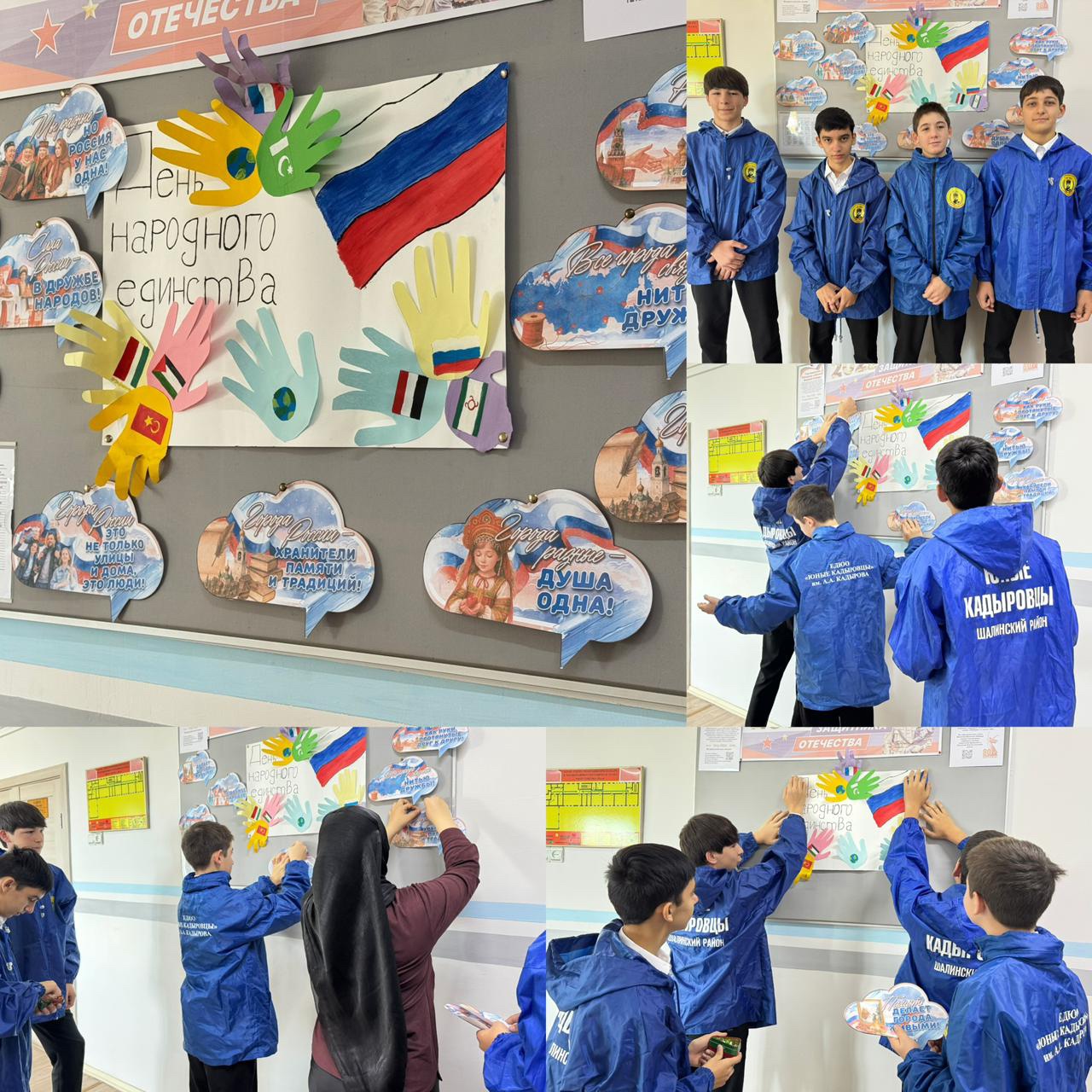 Активисты ЕДЮО « Юные Кадыровцы» оформили информационный стенд ко Дню Народного Единства. На стенде представлены важные факты о празднике, его истории и значении для России. Ребята использовали яркие изображения и цитаты чтобы наглядно представить информацию.