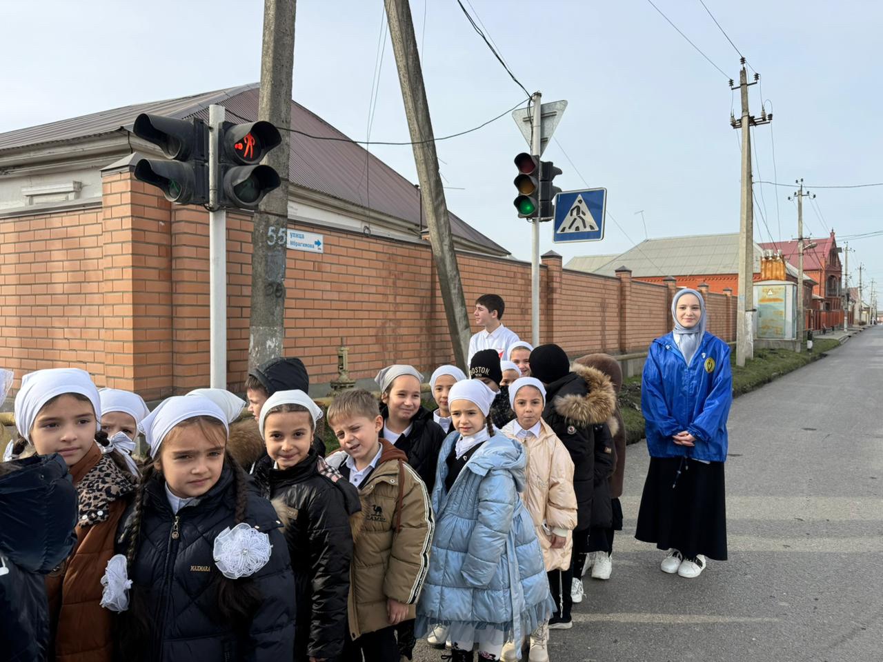 Активисты ЕДЮО «Юные Кадыровцы, ЮИД, РДДМ организовали для учащихся 1-х классов экскурсию к проезжей части дороги, чтобы закрепить знания о правилах дорожного движения; вспомнить правила безопасного поведения на улицах и дорогах. Ребята внимательно наблюдали за двухсторонним движением автомобилей, за действиями пешеходов на переходе на разные сигналы светофора. Дети увидели, как правильно переходят дорогу люди.